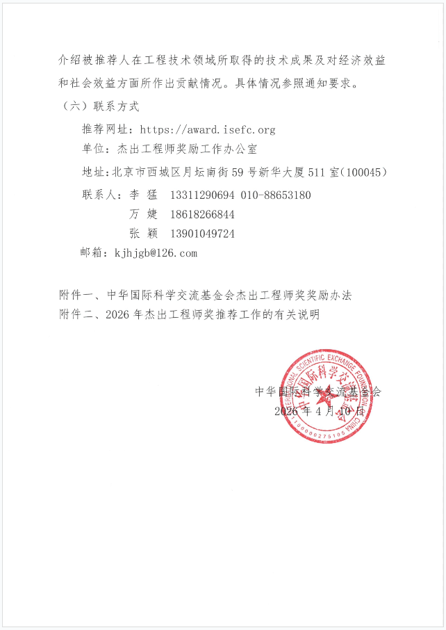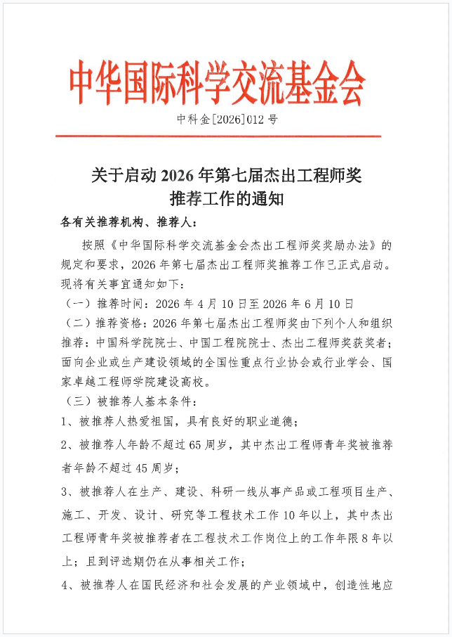 中华国际科学交流基金会关于启动2026年第七届杰出工程师奖推荐工作的通知