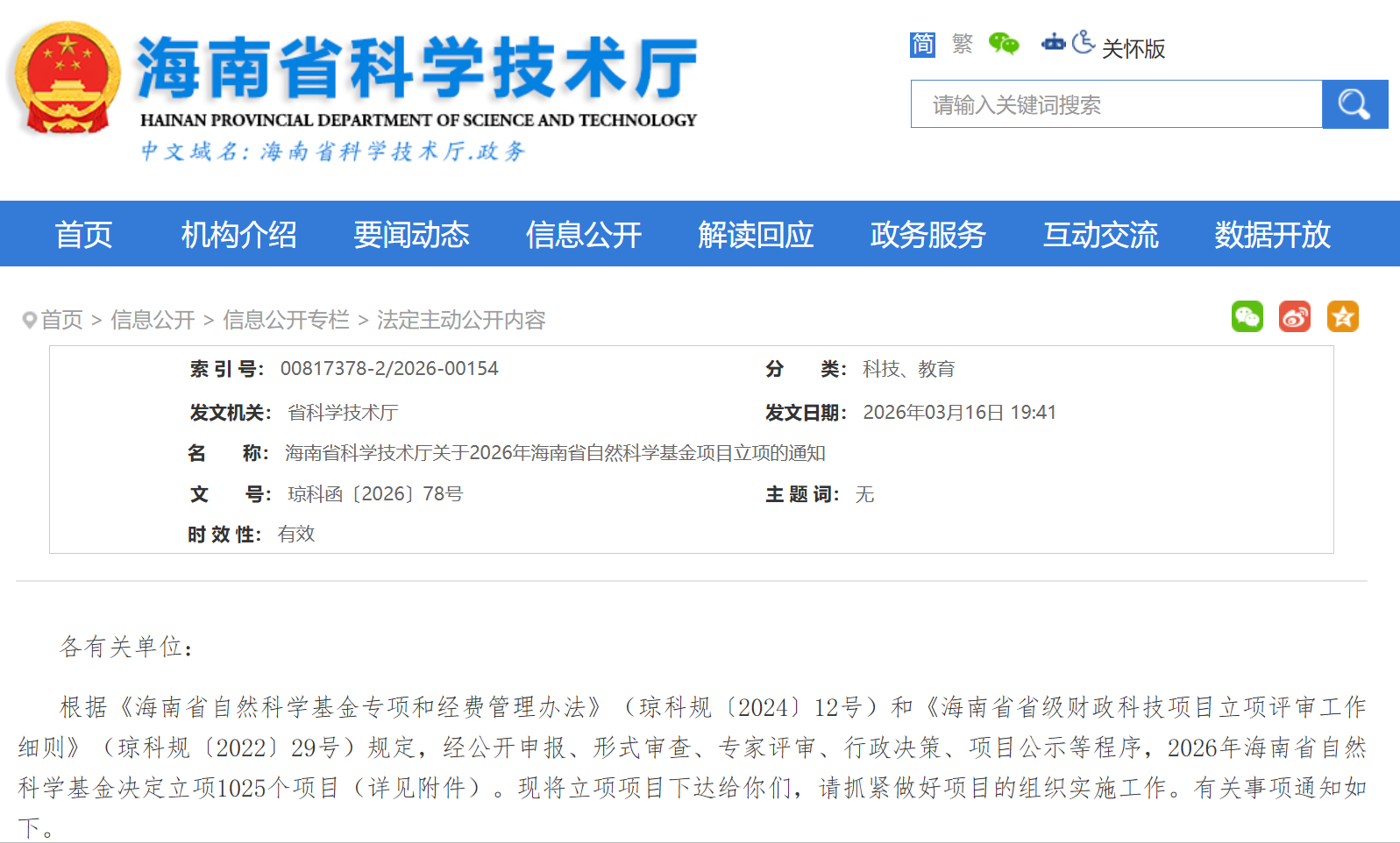 根据《海南省自然科学基金专项和经费管理办法》和《海南省省级财政科技项目立项评审工作细则》规定,经公开申报、形式审查、专家评审、行政决策、项目公示等程序,2026年海南省自然科学基金决定立项1025个项目。