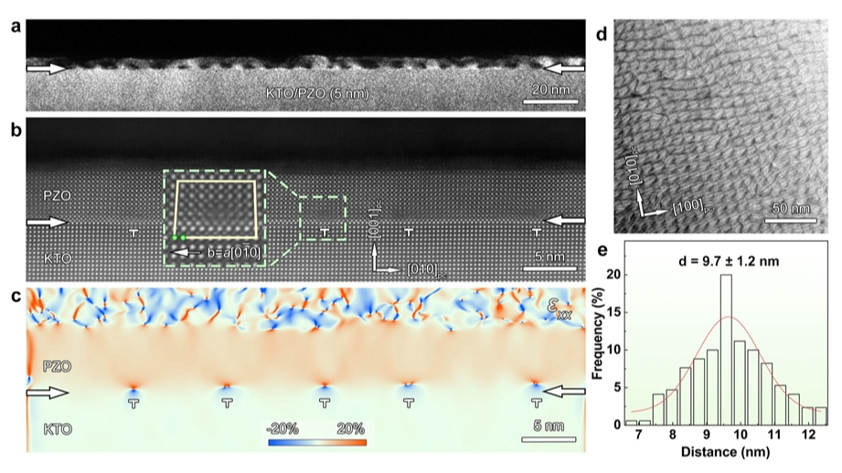 近日,中国科学院东莞材料所、中国科学院金属研究所和松山湖材料实验室等多个科研机构组成的研究团队,在经典反铁电材料——锆酸铅(PbZrO3)薄膜研究中取得重要进展。研究团队发现,电极化拓扑结构与晶体中的一维结构拓扑缺陷(位错)之间存在强相互作用。借助超高分辨电子显微学成像、谱学研究以及相场模拟,他们观察到,作为经典一维拓扑线缺陷的“位错”,其周围产生的应变场能够在超薄PbZrO3薄膜中自发诱导出一种有序排列的极性“反刺猬畴”四方晶格。这是一种此前未曾报道过的全新电极化拓扑结构。3月13日,相关研究成果以“S