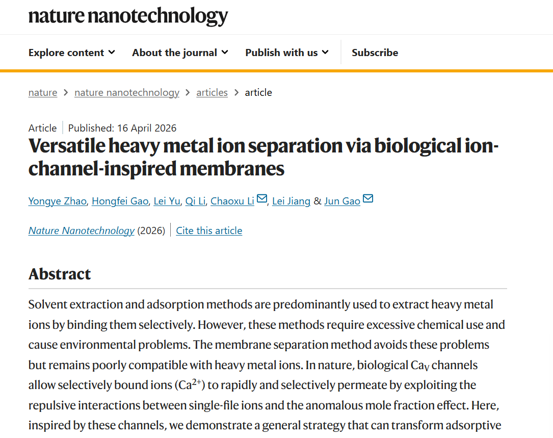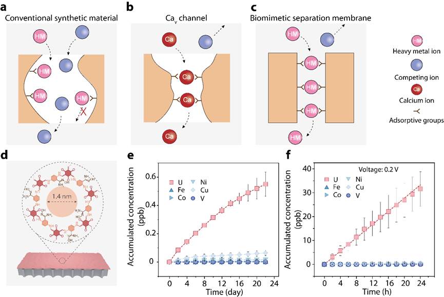 中国科学院青岛生物能源与过程研究所、太阳能光电转化与利用全国重点实验室高军研究员、李朝旭教授联合中国科学院理化技术研究所江雷研究员等人组成科研团队,成功开发出一种受生物钙离子通道启发的普适性重金属离子膜分离方法,可高效、绿色、选择性地提取铀、铜、金等多种对新能源至关重要的重金属资源,有望解决传统重金属资源提取技术高污染、低效率、高能耗的长期难题。相关研究成果于4月16日发表在《自然·纳米技术》上。