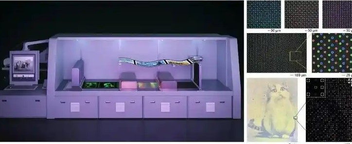 在制备层面,团队自主研发卷对卷增材纳米打印设备,创新高通量按需打印与连续制造工艺,如同报纸印刷一般,将柔性基材在滚筒间连续输送,以纳米级精度快速完成成型,用低成本聚合物纳米材料,即可制备出单像素性能可定制的多尺度光学超材料,首次实现低成本、规模化、个性化量产三者兼顾。