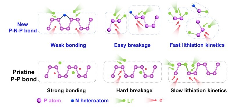 针对行业核心瓶颈,研究团队从原子尺度创新突破,提出晶格磷‑氮(P‑N)键工程化策略,在黑磷负极晶格中精准构筑 P‑N 键。该键可削弱相邻磷‑磷(P‑P)键的共价性,在锂化过程中诱导局部键断裂、活化 P‑P 键,大幅加速电荷传输,显著提升转化反应动力学,从根源解决黑磷负极快充衰减与体积膨胀难题。